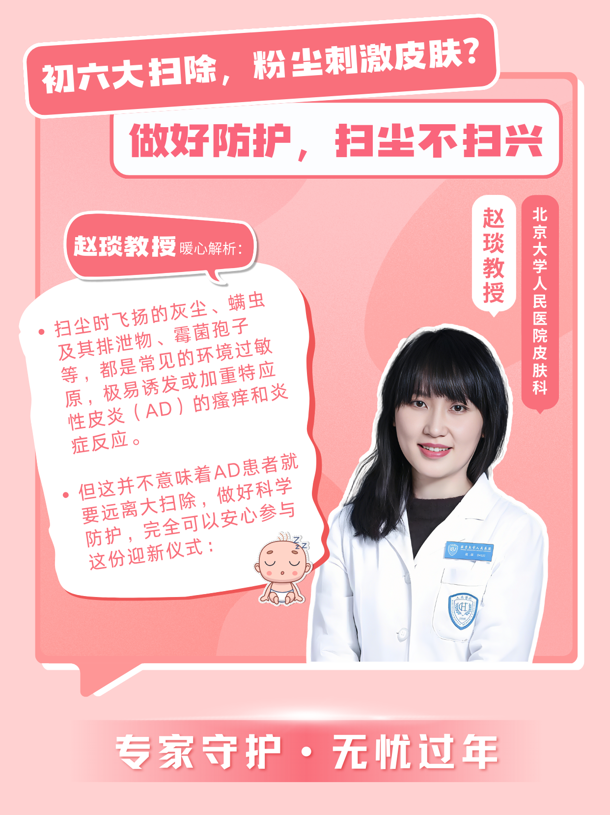 “掃塵時飛揚的灰塵、螨蟲及其排泄物、霉菌孢子等,都是常見的環(huán)境過敏原,極易誘發(fā)或加重特應(yīng)性皮炎(AD)的瘙癢和炎癥反應(yīng)。但這并不意味著AD患者就要遠(yuǎn)離大掃除,做好科學(xué)防護(hù),完全可以安心參與這份迎新儀式: