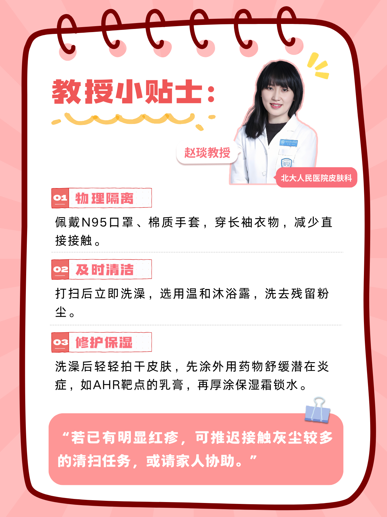 “若已有明顯紅疹,可推遲接觸灰塵較多的清掃任務(wù),或請家人協(xié)助。”