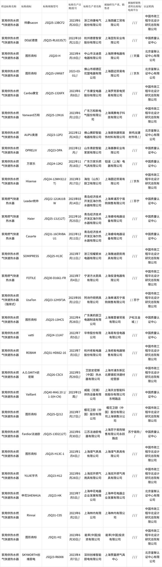 2023年上海市家用燃氣快速熱水器產(chǎn)品質(zhì)量監(jiān)督抽查不合格產(chǎn)品