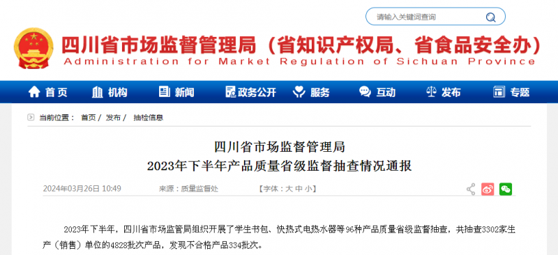 2023年下半年,四川省市場監(jiān)管局組織開展了學(xué)生書包、快熱式電熱水器等96種產(chǎn)品質(zhì)量省級監(jiān)督抽查,共抽查3302家生產(chǎn)(銷售)單位的4828批次產(chǎn)品,發(fā)現(xiàn)不合格產(chǎn)品334批次。