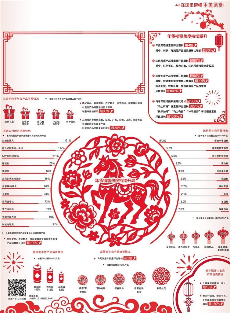 今年年貨消費,既有傳統(tǒng)年味的溫馨熱鬧,又有品質生活的全新表達。從紅火喜慶的馬年裝飾、寓意吉祥的節(jié)慶禮盒,到智能家電、健康按摩、家政服務等新年貨走俏,再到春節(jié)旅行預訂火熱,折射出大眾消費從“圖熱鬧”向“重品質、重實用、重心意”轉變。縣域農村市場里,掃地機器人、智能廚電等成為返鄉(xiāng)孝敬長輩的熱門年貨,更是讓科技溫度融入團圓時刻。新舊交融、城鄉(xiāng)共進的年貨圖景,既藏著中國人不變的團圓情結,也映照著煙火氣里不斷升級的美好生活。