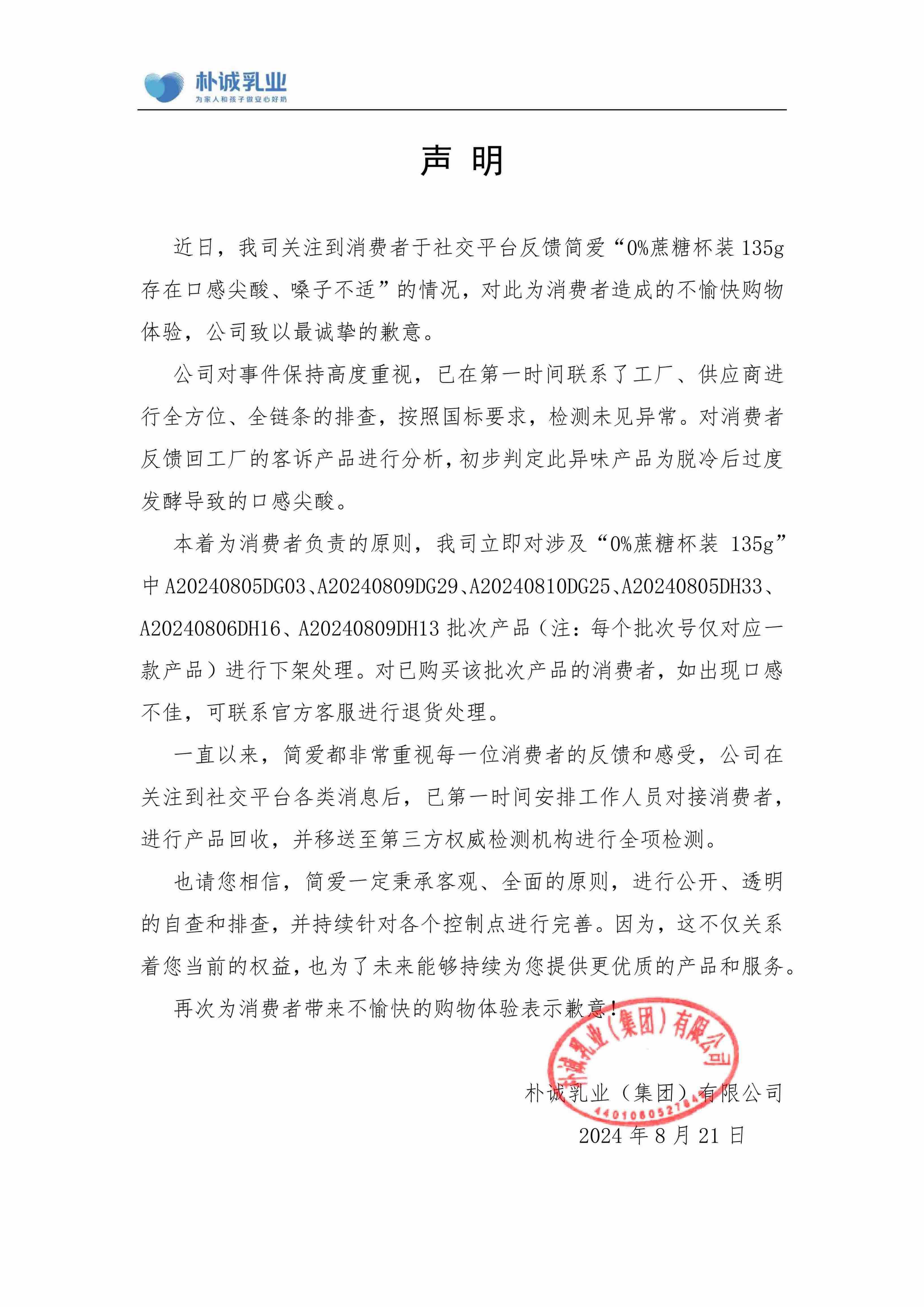 其在向記者發(fā)送的官方聲明中稱,公司已在第一時間聯(lián)系了工廠、供應(yīng)商進行全方位、全鏈條的排查,按照國標要求,檢測未見異常。對消費者反饋回工廠的客訴產(chǎn)品進行分析,初步判定此異味產(chǎn)品為脫冷后過度發(fā)酵導致的口感尖酸。本著為消費者負責的原則,該司立即對涉及“0%蔗糖杯裝135g”中A20240805DG03、A20240809DG29、A20240810DG25、A20240805DH33、A20240806DH16、A20240809DH13批次產(chǎn)品進行下架處理。對已購買該批次產(chǎn)品的消費者,如出現(xiàn)口感不佳,可聯(lián)系官方客服進行退貨處理。