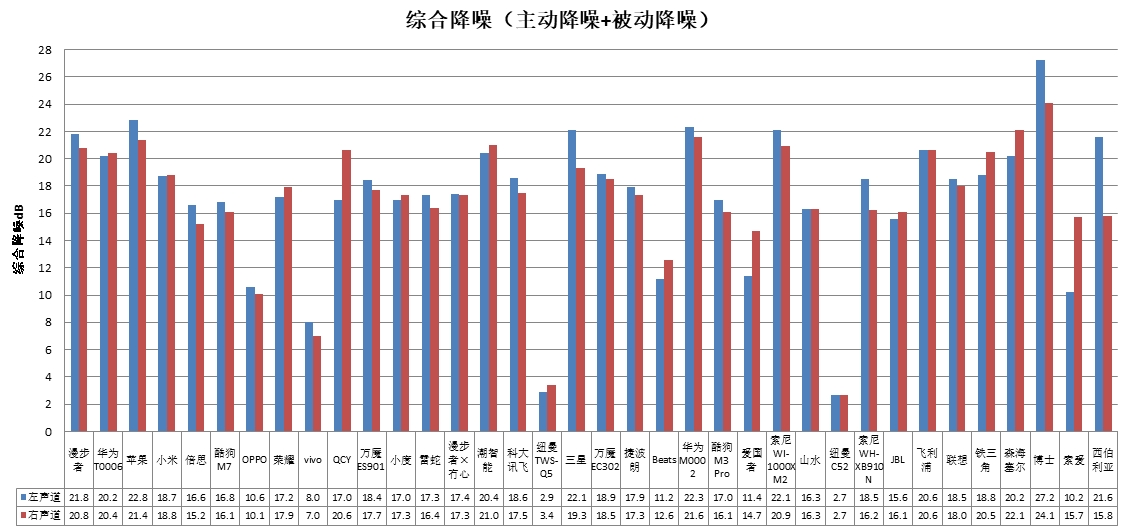 本次綜合降噪測試,指的是主動降噪和被動降噪疊加的總體降噪,也是模擬消費者佩戴耳機在日常的噪聲環(huán)境下最直觀的感受。由于參與測試的部分耳機不具備主動降噪功能,所以降噪評價采用綜合降噪(主動降噪+被動降噪),綜合降噪可以更真實地反映消費者最直觀的感受。