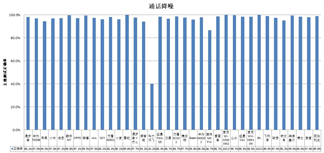 本次比較的36款無線耳機中,通話降噪能力出色的是索尼(WI-1000XM2)和JBL哈曼,接聽記錄錯誤率0%,通話降噪效果好,完全沒有受到噪聲影響,接聽語音非常清晰;2款無線耳機降噪能力比較弱,接聽記錄錯誤率超過10%,分別為科大訊飛和酷狗(酷狗M3 Pro)耳機,通話降噪欠佳的耳機在噪聲環(huán)境下,如地鐵、火車站、餐廳等地點通話,會導致對方收音不清晰,無法正常交流。