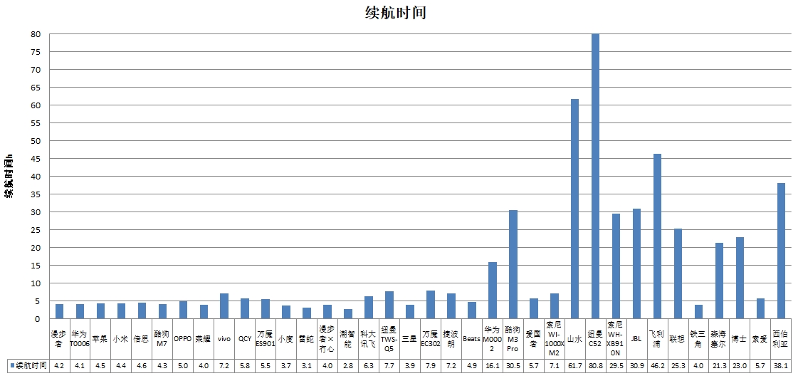 無線耳機的續(xù)航能力由無線耳機的續(xù)航時間和充電時間兩項指標呈現(xiàn),各種類型的耳機有很大差別。