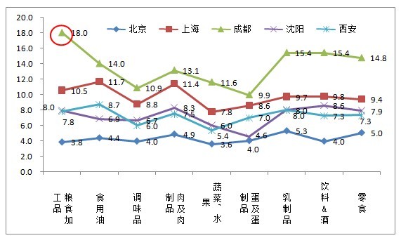 雖然成都、上海對食品安全過去一年的改善情況,現(xiàn)狀及未來發(fā)展趨勢都不是很樂觀,但是這兩個城市的安全信心指數(shù)增長情況卻是最快的。尤其是成都,其糧食加工品的安全信心指數(shù)增長高達18個點。