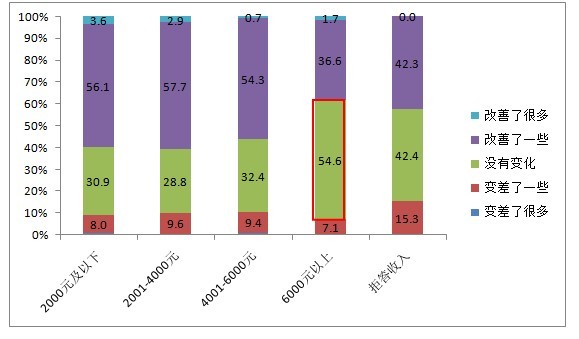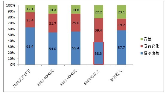 收入水平在6000元以上的市民,認(rèn)為過去一年食品安全沒有改善的人數(shù)遠(yuǎn)大于認(rèn)為有所改善的人數(shù)。
