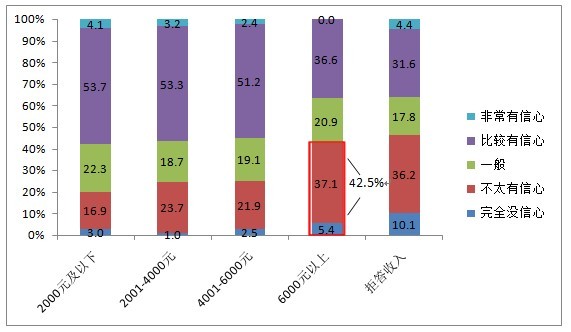隨著人們收入水平的提高,大家對(duì)于食品安全越發(fā)沒有信心,數(shù)據(jù)顯示,除了拒絕透露收入水平的人群外,6000元以上的高收入人群對(duì)現(xiàn)狀沒有信心的比例最高,超四成。