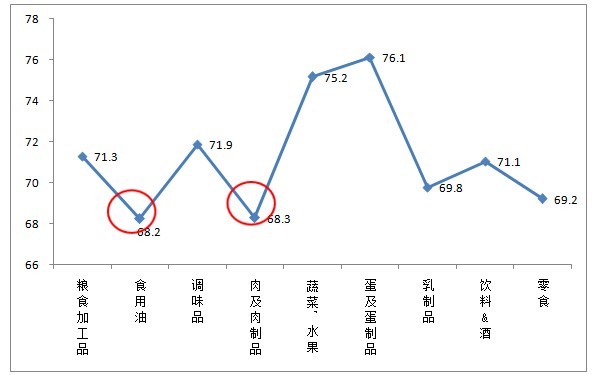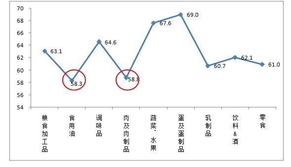 進(jìn)一步分析發(fā)現(xiàn),6000元以上高收入人群對(duì)食用油、肉及肉制品這兩類食品的安全信心指數(shù)最低,直接影響了對(duì)食品安全現(xiàn)狀整體的信任度。