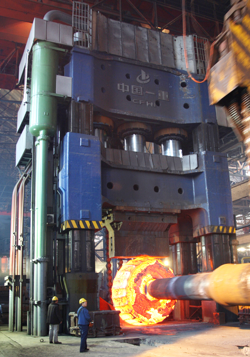 在鍛壓裝備生產(chǎn)領(lǐng)域,有一臺(tái)令中國一重人驕傲和自豪的設(shè)備。這臺(tái)設(shè)備就是中國一重自行設(shè)計(jì)并制造的當(dāng)時(shí)國內(nèi)首臺(tái)、世界最先進(jìn)的“新鋼鐵巨人”———1.5萬噸自由鍛造水壓機(jī)。中國一重在這臺(tái)設(shè)備的研制中,獨(dú)創(chuàng)了多項(xiàng)具有自主知識(shí)產(chǎn)權(quán)、代表世界先進(jìn)水平的設(shè)計(jì)技術(shù)。