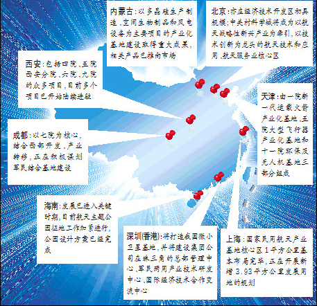 上海國(guó)家民用航天產(chǎn)業(yè)基地核心區(qū)1平方公里基本布局完畢,并正在開(kāi)展新增3.93平方公里發(fā)展用地的概念性規(guī)劃和控制性詳細(xì)規(guī)劃。西安國(guó)家民用航天產(chǎn)業(yè)基地包括四院、五院西安分院、六院、九院的眾多項(xiàng)目,目前多個(gè)項(xiàng)目已開(kāi)始陸續(xù)進(jìn)駐。在四川成都,以七院為核心,結(jié)合西部開(kāi)發(fā)、產(chǎn)業(yè)轉(zhuǎn)移,正在積極謀劃軍民結(jié)合基地建設(shè)。在中國(guó)北疆的內(nèi)蒙古,集團(tuán)公司以多晶硅生產(chǎn)制造、空間生物制品和風(fēng)電設(shè)備為主要項(xiàng)目的產(chǎn)業(yè)化基地建設(shè)取得重大成果,相關(guān)產(chǎn)品已推向市場(chǎng),取得了較好的經(jīng)濟(jì)效益。