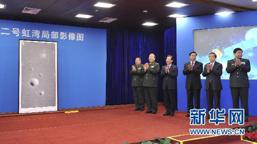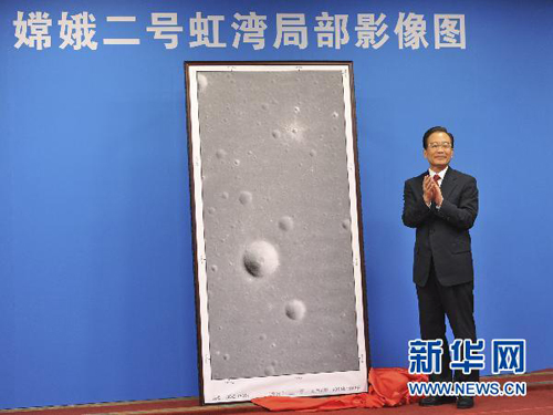 11月8日,探月工程嫦娥二號(hào)月面虹灣局部影像圖揭幕儀式在北京舉行,中共中央政治局常委、國(guó)務(wù)院總理溫家寶出席揭幕儀式并為影像圖揭幕。(新華社記者 黃敬文/攝)