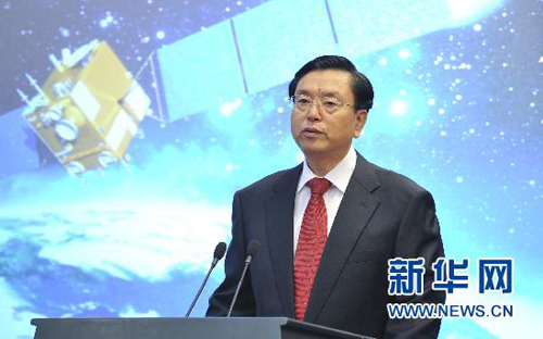 11月8日,探月工程嫦娥二號(hào)月面虹灣局部影像圖揭幕儀式在北京舉行,中共中央政治局常委、國(guó)務(wù)院總理溫家寶出席揭幕儀式并為影像圖揭幕。這是中共中央政治局委員、國(guó)務(wù)院副總理張德江宣讀《中共中央 國(guó)務(wù)院 中央軍委對(duì)探月工程嫦娥二號(hào)任務(wù)取得圓滿(mǎn)成功的賀電》。(新華社記者 黃敬文/攝)